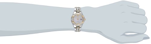 -. Feature : Solar-powered dress watch in two-tone stainless steel with crystal-accented bezel and date window at three o'clock / Japanese-quartz movement with analog display / Protective hardlex crystal dial window / Features push-button-clasp closure / Water resistant to 165 feet (50 M): suitable for swimming and showering