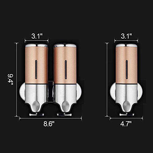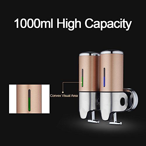 - DOUBLE BOTTLES SHOWER DISPENSER DESIGN: A bottle can hold shower gel, another one can hold shampoo or hand sanitizer. They have 1000ml high capacity.