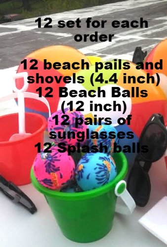 - Feature : 12 beach Pails With Shovels 4.25'' / 12 rainbow Colored 12 inch Beach Balls / 12 Sunglasses / 12 Splash balls / Great set for the day at the beach , 12 full SETS INCLUDED.