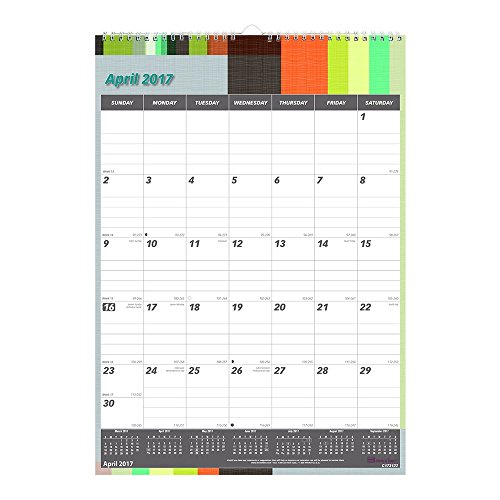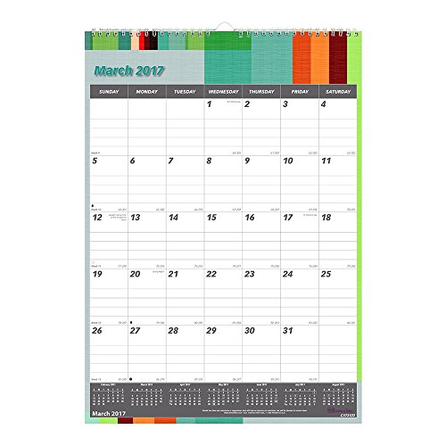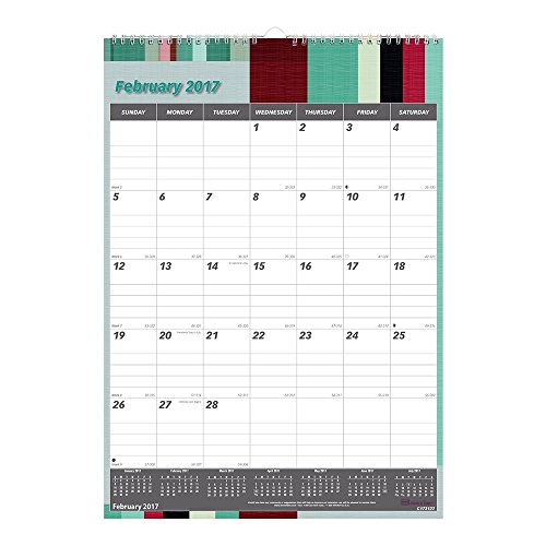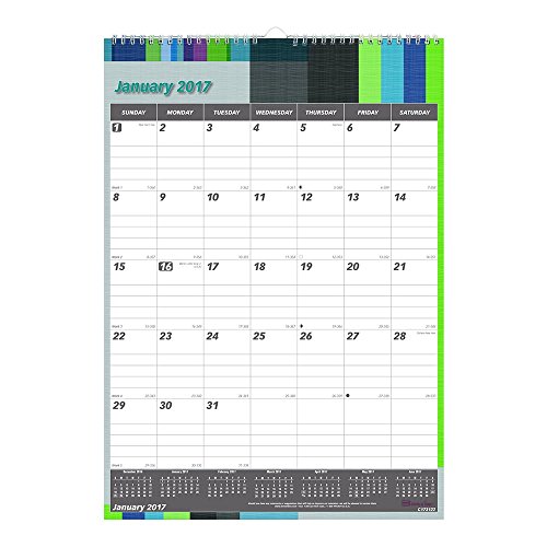 -. Feature : Colorful calendar, colors alternating every 4 months / Reinforced chipboard backer / One month on each sheet, one ruled block per day / Past, current and 5 following months at the bottom of each sheet / Twin-wire binding with eyelet to suspend