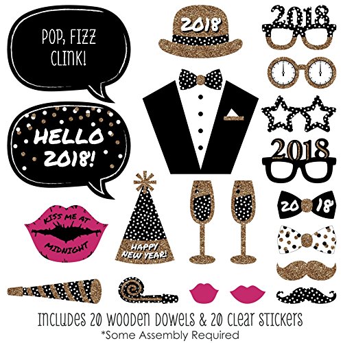 - 20-Piece New Year’s Eve Party Photo Booth Props Kit INCLUDES 20 Pop, Fizz, Clink! 2018 New Years photo booth props, 20 wooden dowel sticks and adhesives for assembly. EASY ASSEMBLY: Simply attach the printed DIY photo booth props to the wooden dowels with included adhesive and reinforcing stickers.