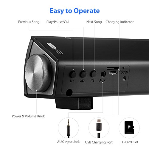 POWERFUL & CLEAR SOUND BAR FOR TV: Maximum 80 dB surround sound covers over 300 sq. ft. The soundbar provides crystal clear sound with dual high quality surround sound speakers and unique anti-noise technology.
