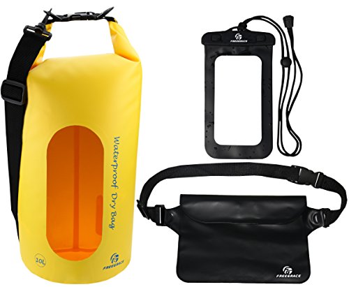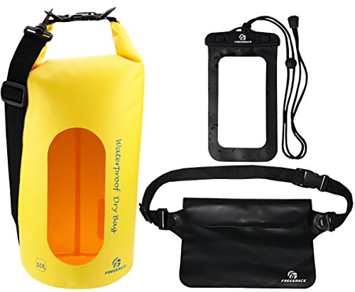 Waterproof Dry Bags Set Of 3 By Freegrace - Dry Bag With 2 Zip Lock Seals & Detachable Shoulder Strap, Waist Pouch & Phone Case - Can Be Submerged Into Water - For Swimming (Yellow(Window), 10L)