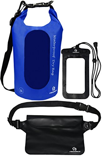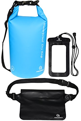 Waterproof Dry Bags Set Of 3 By Freegrace - Dry Bag With 2 Zip Lock Seals & Detachable Shoulder Strap, Waist Pouch & Phone Case - Can Be Submerged Into Water - For Swimming (Sky Blue, 5L)