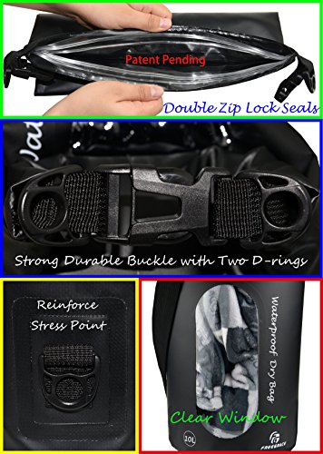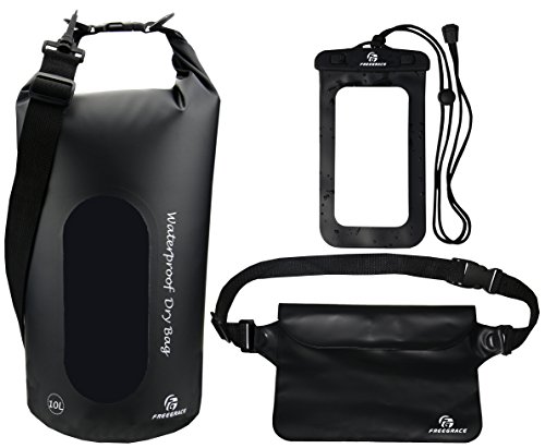 Waterproof Dry Bags Set Of 3 By Freegrace - Dry Bag With 2 Zip Lock Seals & Detachable Shoulder Strap, Waist Pouch & Phone Case - Can Be Submerged Into Water - For Swimming (Black, 10L)