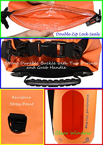 Waterproof Dry Bags Set Of 3 By Freegrace - Dry Bag With 2 Zip Lock Seals & Detachable Shoulder Strap, Waist Pouch & Phone Case - Can Be Submerged Into Water - For Swimming (Orange(Window), 20L)