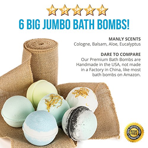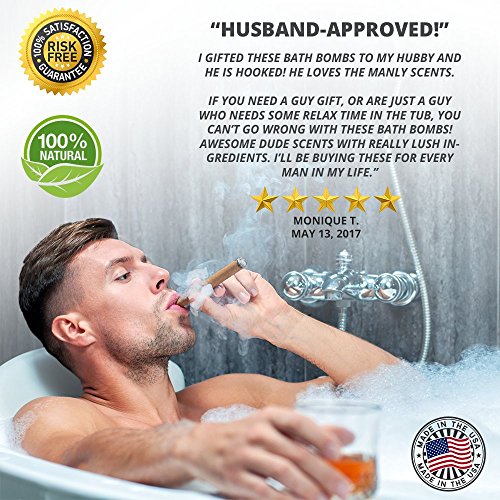 - ✔️ HANDMADE LUXURY BATH BOMBS: Our Bath Bombs are high-quality and loved by both men and women. DARE TO COMPARE! 6 individually-wrapped, generously sized assorted Bath Bombs (5 Ounces Each). Light Scented with Men-Approved Fragrances - Mint (For Renewal), Cologne (for Reinvigoration) and Green Tea (for Relaxation.)