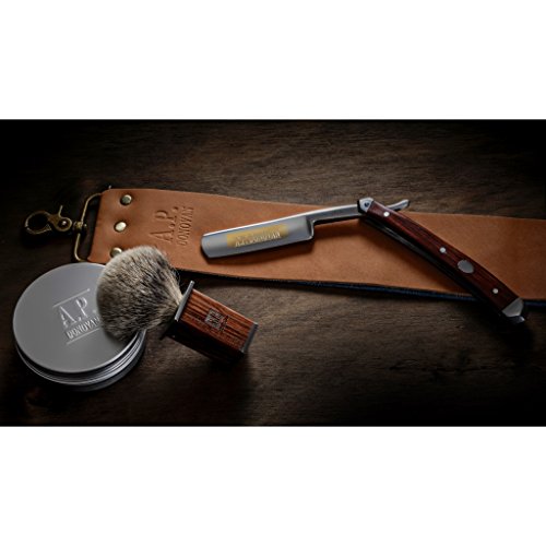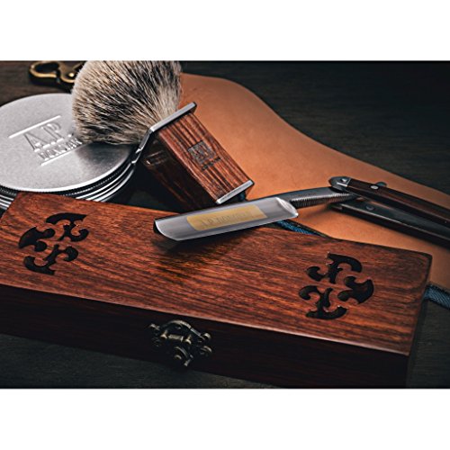 Each razor of A. P. Donovan comes in a decorative real wood box. The noble character of the gift box is highlighted by arabesque carvings hole in the lid and the finely crafted metal buckle. A velourbeschichtete foam insert inside reliably prevents scratches on handle and blade razor. As a personal gift case or for safe transport for traveling: This box proves a quality razor honor.