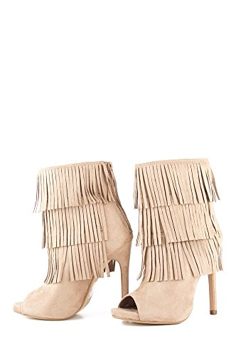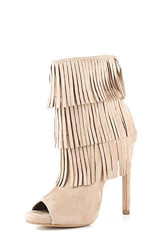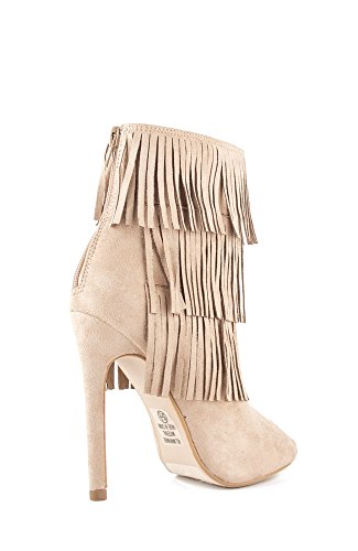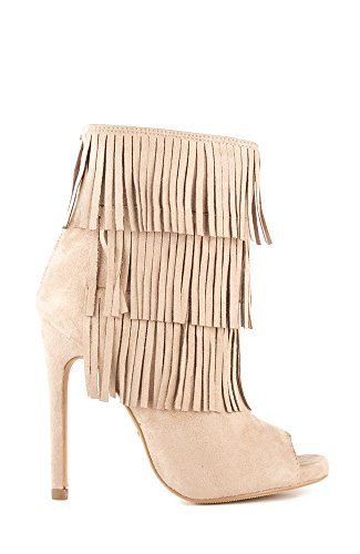 (Delicious)/Women's/Boots/DIRECT FROM USA/Delicious GAIN Women's Boho Chic Peep Toe Suede Fringe Tiers Bootie - Light Taupe Suede