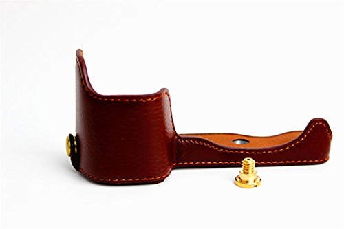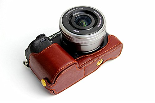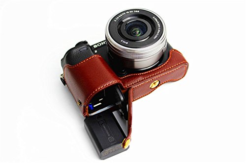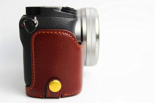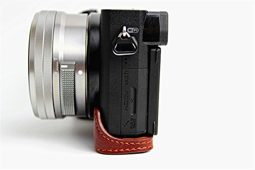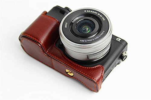 Hwota Handmade Genuine Real Leather Half Camera Case Bag Cover for Sony Alpha A6000 A6300 Bottom Opening Version + Free Leather Hand Strap -Coffee
