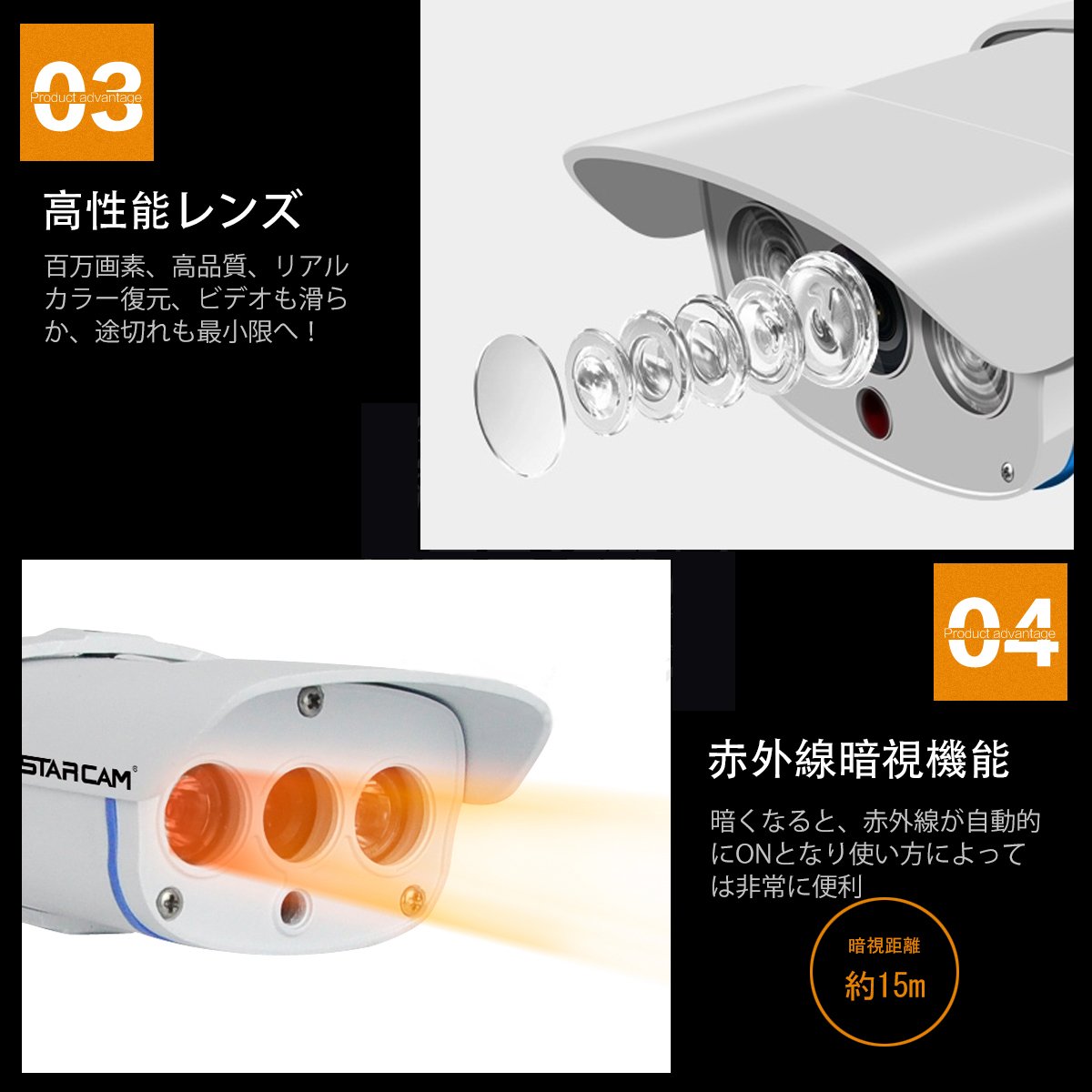 The camera body is equipped with two infrared lamps, and when the camera periphery gets dark at night, etc., it can automatically shoot with infrared rays and shoot in black and white even in darkness up to about 15 meters.