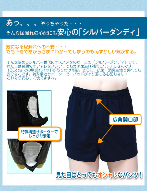 あっ、どうしよう・・・気になる尿漏れに、オシャレな健康パンツが登場!その名も「シルバーダンディ」。150ccまでの尿漏れパッドが取り付け可能!抗菌・消臭効果でさらに安心です。