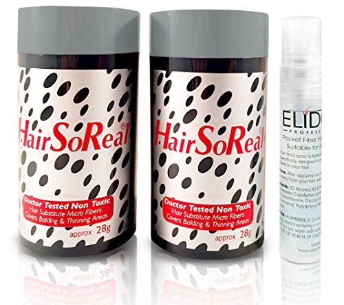 -. Binding : Health and Beauty -. Brand : HairSoReal -. Color : Dark Brown -. EAN : 0046737929542 -. Feature : This Bundle includes: 2 Bottles of Hair So Real - Dark Brown. Each bottle contains 28grams of fiber. Free Elidor pocket fiberhold spray is also included. / Hair So Real Hair Building Fibers will conceal hair loss and Thinning Hair in less than a minute. / HairSoReal was designed to camouflage thinning hair and bald spots by filling them in with microscopic hair fibers. / Shaking the Hair So Real fibers over your head permits them to get electrically charged so they can stick to your hair. / Bald spots get covered and thinning hair gets thicker thanks to the new hair created by the fibers. -. IsAdultProduct : 0 -. Label : Hair So Real -. Manufacturer : Hair So Real -. Model : No Model -. MPN : No Part Number -. PackageQuantity : 2 -. PartNumber : No Part Number -. ProductGroup : Beauty -. ProductTypeName : HEALTH_PERSONAL_CARE -. Publisher : Hair So Real -. Studio : Hair So Real -. Title : 2 x HSR, Hair So Real, Hair Loss Concealer Fiber (Dark Brown) with Free Elidor Pocket Fiberhold Spray -. UPC : 046737929542