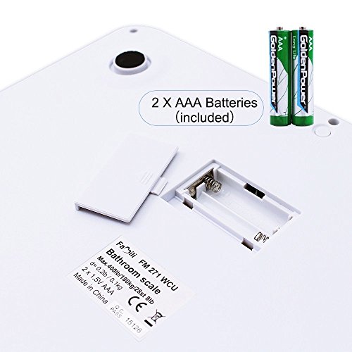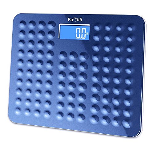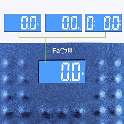 -. Brand : Famili -. Color : Royal Blue -. EAN : 0884538314477 -. Feature : Smart Step-on technology - No more tapping or turning on a switch to use the scale. Just step on the scale to get instant readings Famili digital bathroom scale track body composition changes to maintain a healthy lifestyle with antiskid wide platform for user safety, and three available units of measure: lb:oz/kg/st / Wide application range 11lb/5kg - 400lb/180kg; graduation increments of 0.2lb/0.1kg Extra-large LCD screen with Backlight makes it easy and straightforward to read your weight from any distance Famili digital weight scale powered by 2 AAA batteries (included) 100% satisfication guarantee and one year Famili warranty in normal operation. / Step-on Technology - Famili bathroom scale allows you to simply step onto the scale and in seconds you'll have an accurate readout to the nearest. No more "waking up" your scale by tapping or pressing buttons. / High Accuracy & Auto-calibration - Equipped with latest version high precision sensor, consistently and accurately measure up to 400 pound or 180 kilogram; graduation increments of 0.2 pound/ 0.1 kilogram. Measure units are available in pound, kilogram. Auto- calibration also contribute to the accurancy and consistence. / Durable Materials - The tempered platform provides extra strength making it durable and convenient. It was built to last with the highest grade craftsmanship. -. Label : Famili -. Manufacturer : Famili -. Model : FM271WCU -. ProductGroup : Kitchen -. ProductTypeName : KITCHEN -. Publisher : Famili -. Size : 12.992L x11.811 W x 0.945H inch (330L x 300 W x24H -. Studio : Famili -. Title : 400lb/180kg LCD Digital Bathroom Body Weight Scale With Antiskid Wide Platform Smart Step-on Technology Free 3 yr Protection -. UPC : 884538314477