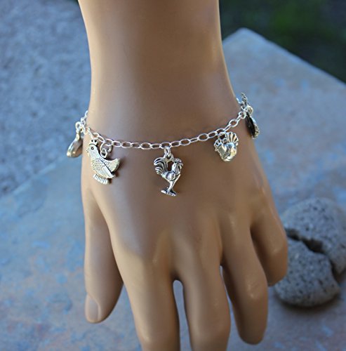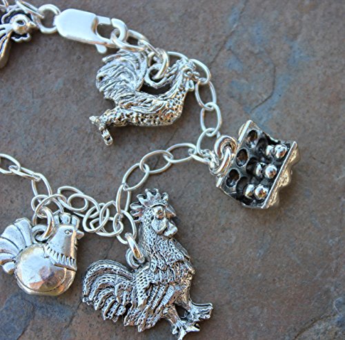 -. Title : Roosters, Hens, Chickens + Eggs Charm Bracelet - Pewter Fowl Charms, Sterling Silver Chain- Sizes XS-XL