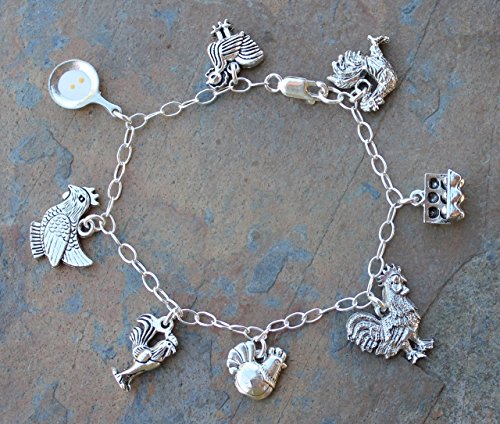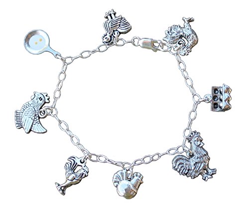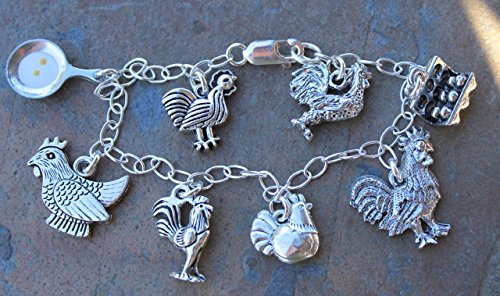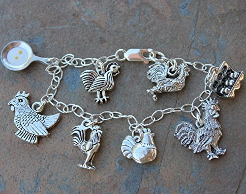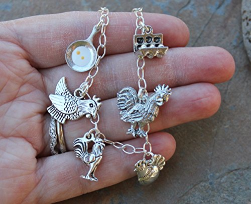 -. Feature : 8 cute chicken, rooster and egg themed charms on a sterling silver bracelet. / Available in size XS (6.5"), S (7"), M (7.5"), L (8") & XL (8.5"). PICK SIZE FROM BOXES BELOW TITLE / Charms range from 1/2 inch to 1 inch tall and are a mix of zinc alloy and pewter. All charms are lead and nickel free. / Sterling silver bracelet chain and lobster clasp. Delicate but strong. / Handmade in the USA by Night Owl Jewelry.