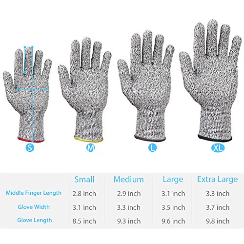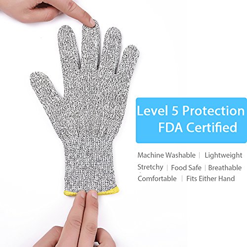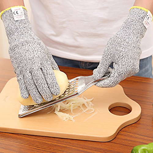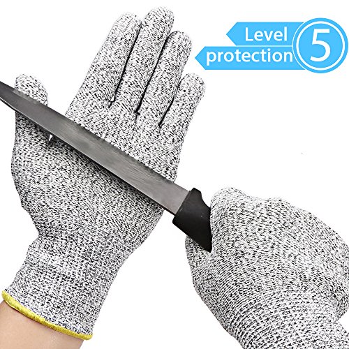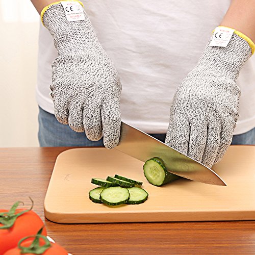 - DURABLE CUT RESISTANT KITCHEN GLOVES: Made of Uhmwpe, awarded with the highest EN388, level 5 cut resistance 4 times stronger than leather, protecting your hands from scrapes and cuts.