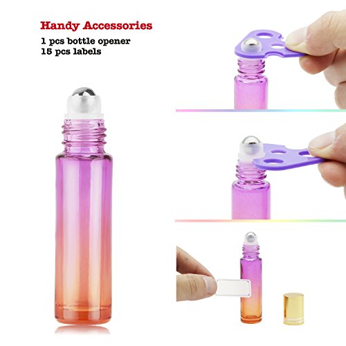 - Handy accessories: this glass roller bottle set comes with 15 pieces carefully designed adhesive labels to help you differentiate the oils you put in each bottle, and 1 piece bottle opener to help lift/remove the orifice reducer insert or press it back on bottles with standard capacity of 1ml, 3ml, 5ml, 10ml or 15ml.