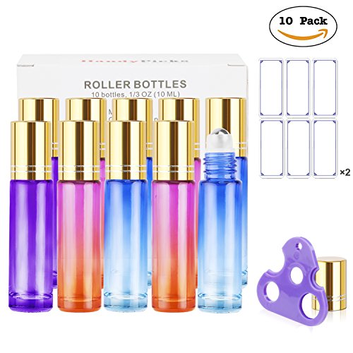 Essential Oil Roller Bottles 10ml (Colorful Set, Pack of 10) - Stainless Steel Roller, Individual Package per Bottle, Opener n Labels Included - Glass Roller...