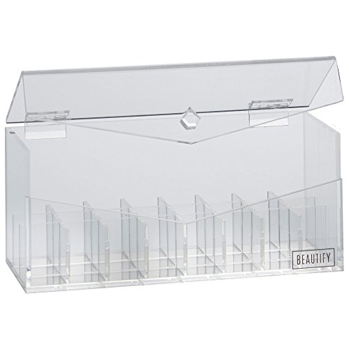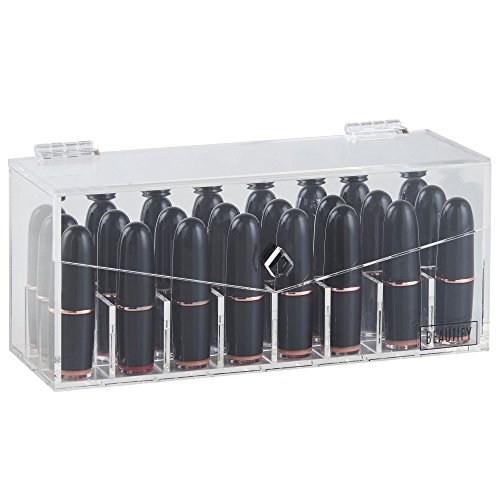 Made from durable 5mm thick premium clear acrylic in an attractive contemporary design which has been built to last. A dust-proof hinged lid protects your lipsticks and keeps them clean. Compact size measures in at 9" x 3.6" x 4", and will take up limited space on your bedroom dressing table, bathroom counter or desk.