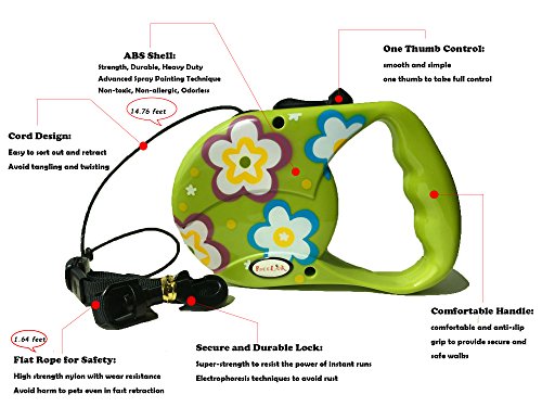 Reelok Green Beautiful Flower Patterns Automatic Retractable Cord Leash 16 feet 5 M 45 Pounds Durable Heavy Duty Super Strength Dog Pet Safe Walk