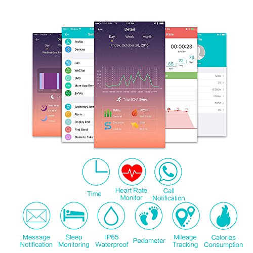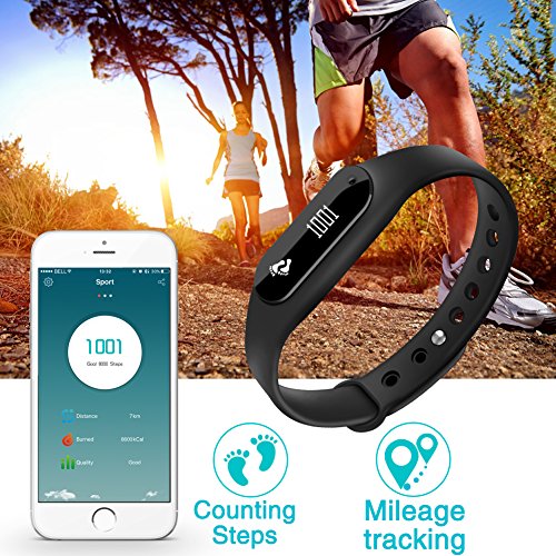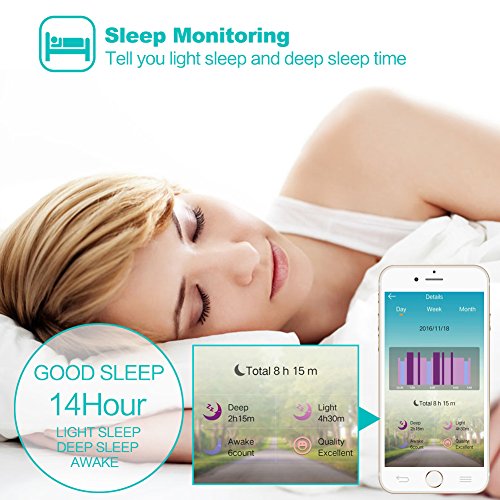 -. Feature : Pedometer: Tracks steps, distance and calories burned. / Sleep Monitoring: Monitors how long and well you sleep. / Smart Alarm: Wakes you (and not your partner) with a silent wake alarm. / Online Upgrade, Heart Rate Monitoring, Anti-lost, Call and text alerts, Shake to take photos, etc. / Professional Customer Service of 1 Yr Warranty & 30-Day Money Back Guarantee.