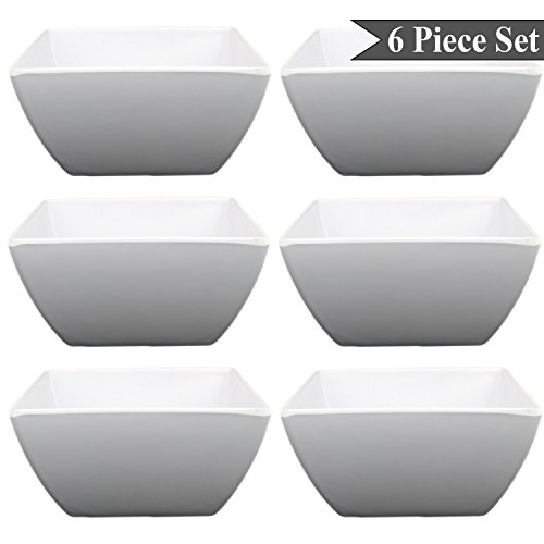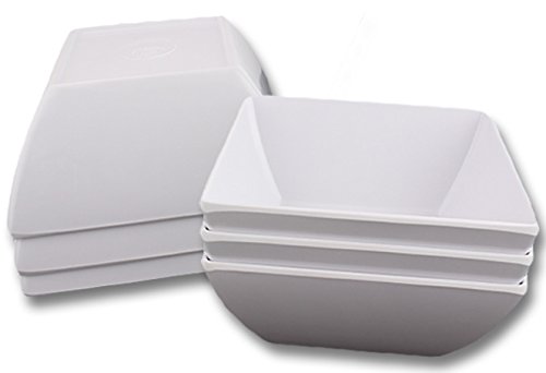 Square White Melamine Soup Salad Pasta Ice Cream Bowls (6") Set of 6 by bogo BrandsAdd this set of 6" square bowls (for soup, pasta, salads, cereal ice cream and more) to your collection for everyday dining. Made of durable melamine, these bowls are break-, chip- and shatter-resistant. Simple white color adds a ceramic-looking elegance to your table. Easy to clean (dishwasher or hand wash), these BPA-free bowls are heat resistant; however, they are not recommended for microwave or oven use. Ideal for daily use in the house-casual dining, parties, all meals-you can also use these plates at outdoor events like picnics, camping and tailgate parties. Sturdy enough for commercial use in restaurants, bars or other food services.