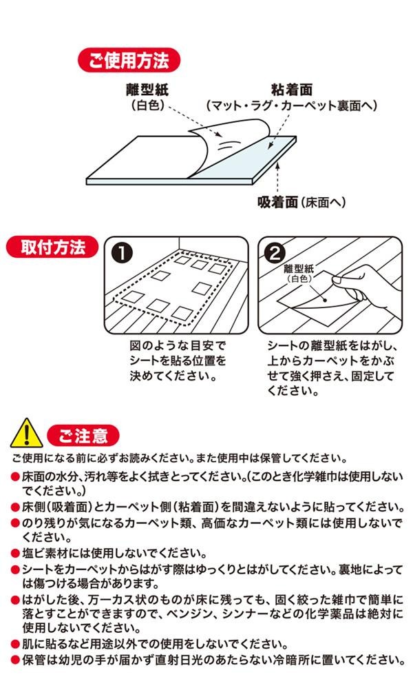 | ミクロの吸盤でカーペット・マット・ラグなどのズレを防止します!!はがす時はのり残りもなく、キレイにはがせますので床を汚しません。 |