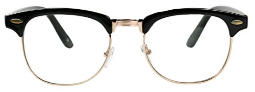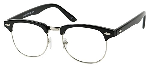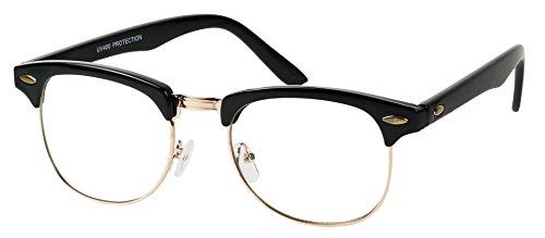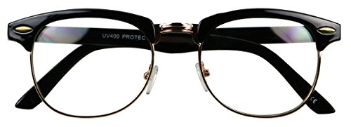 Product Description Achieve the classic and stylish sophisticated look with these unique horn rim riveted glasses. Feature full metal half rim in gold and silver tones with metal temple rivets. Enforced with metal hinges and extremely durable plastic materials on the frame. Include clear polycarbonate lenses that still have 100% UV protection from the suns harmful rays. 0