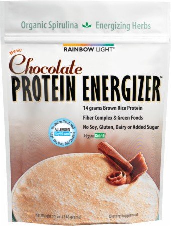 Rainbow Light Chocolate Protein Energizer Dietary Supplement Powder, is an easy to digest, delicious low-fat, low-carb vegetarian protein shake with no added sugar, featuring 15 grams of 100% hypoallergenic rice protein, stimulant-free energy support from adaptogenic herbs, plus 500 mg of spirulina and over 7 grams of fiber.Feature