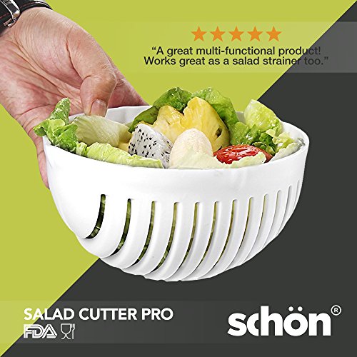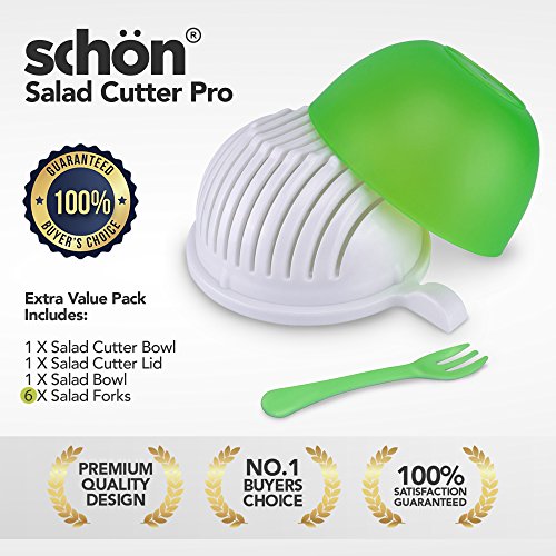 • BONUS – The Schon salad cutter comes with spoons and a bowl.