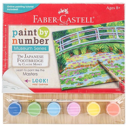 -. Binding : Toy -. Brand : Faber Castell -. EAN : 0092633303467 -. Feature : Learn artists techniques used by the masters. / 6"X8" canvas, pop up easel, brush, 6 acrylic colors and hang tab / Illustrated instructions and online tutorial / Allows artists to follow the guide or color in their own unique way. / Ideal for young artists ages 8 and up -. IsAdultProduct : 0 -. Label : Creativity For Kids -. Manufacturer : Creativity For Kids -. MPN : FC14302 -. PackageQuantity : 1 -. PartNumber : FC14302 -. ProductGroup : Toy -. ProductTypeName : TOYS_AND_GAMES -. Publisher : Creativity For Kids -. Studio : Creativity For Kids -. Title : Paint By Number Museum Series Claude Monet The Japanese Footbridge -. UPC : 092633303467