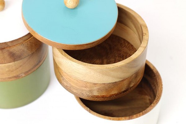 きれいに塗られたカラーと木目の自然の風合いがおしゃれ。 生産国:タイ 商品サイズ:縦約11cm×横8.7cm×奥行8.7cm ※サプライヤー直送品 ご注文後5~6営業日後の出荷となります【商品名】アカシア スタッキングボックス ラウンド ターコイズ 45076147