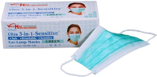 ValuMax 5630E-GR Ultra-3-In-1 Sensitive Disposable Earloop Face Masks, Cellulose Inner Layer, High Filtration, Green, Box of 50