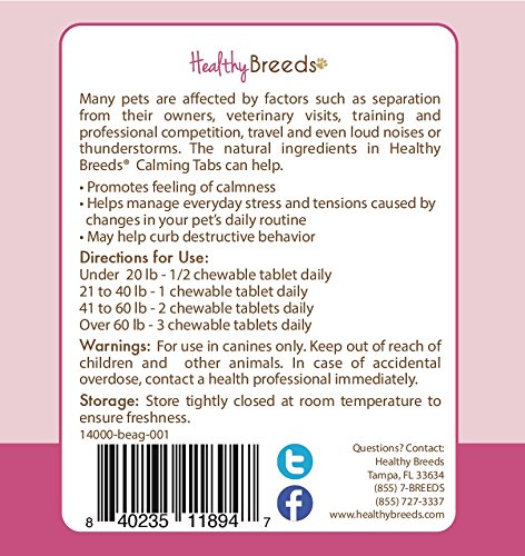 Many pets are affected by factors such as separation from their owners, veterinary visits, training and professional competition, travel and even loud noises or thunderstorms. The natural ingredients in Healthy Breeds Calming Tabs can help. Just like humans, dogs experience aniexty. Whether they are in new surroundings, separated from love ones or loud noises like fireworks. Your dog may bark, scratch, urinate, shake, or show aggressive behavior. Our calming tabs are formulated to relieve the aniexty feelings and let your dog behave more normally. Dogs love the taste of these tabs. Active Ingredients (per chewable tablet): Chamomile45 mg Dried Hops45 mg Ginger Root Extract35 mg L-Taurine20 mg L-Tryptophan4 mg. Directions for Use: