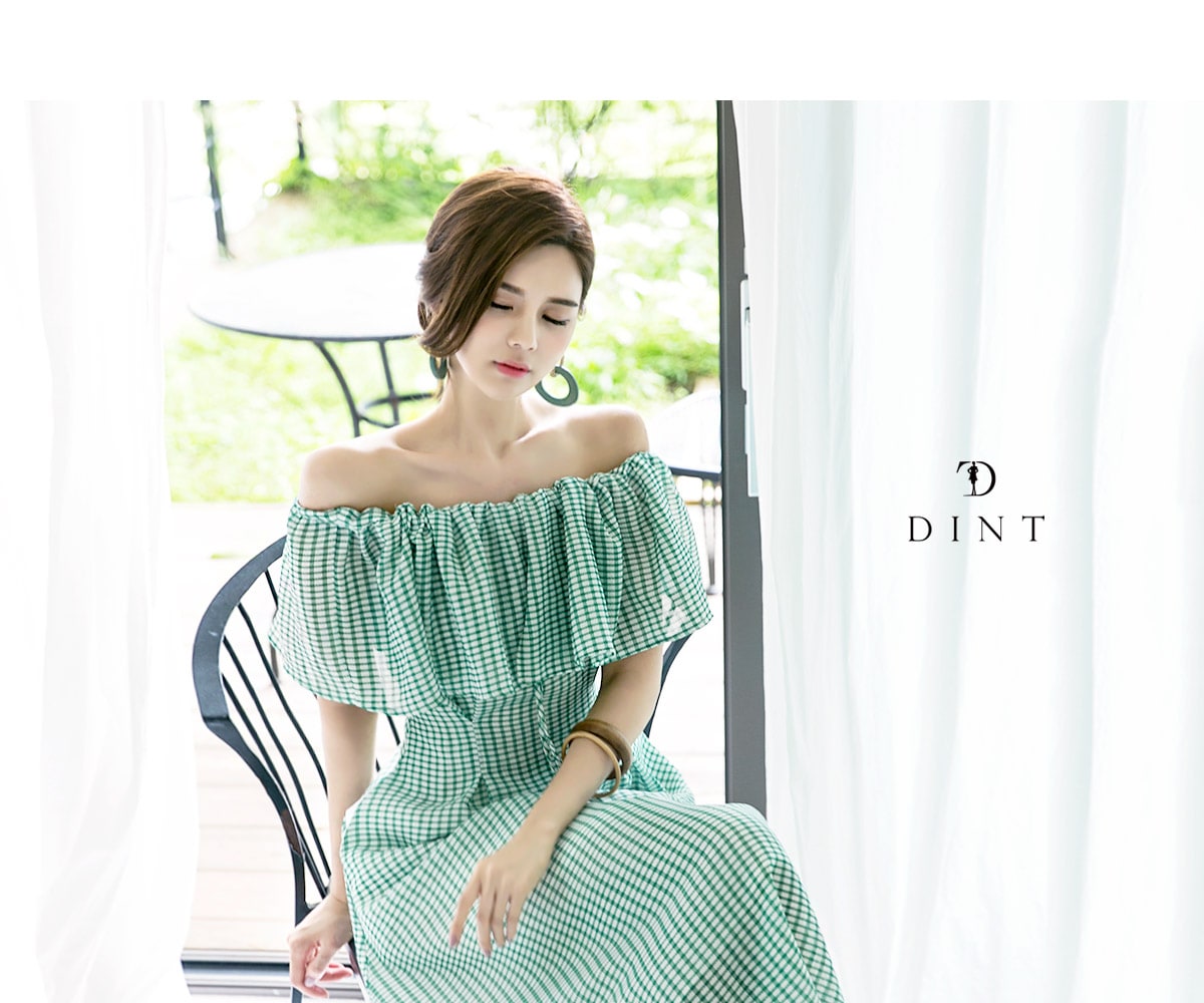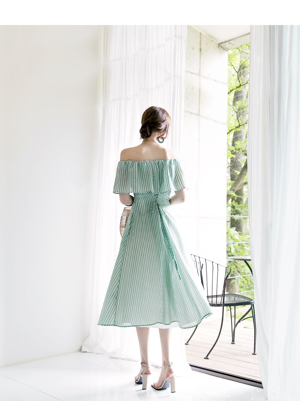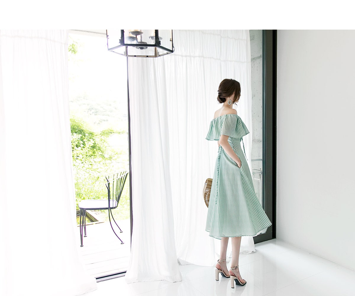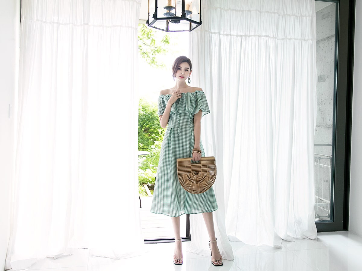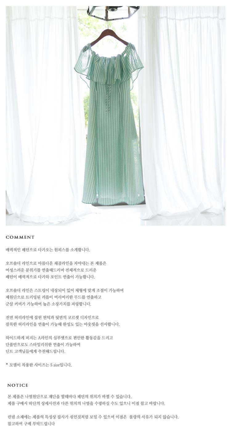 D3591 러플 스트링 라인 오프숄더 린넨 원피스 Green mix