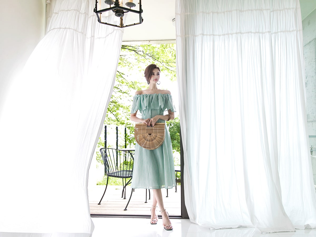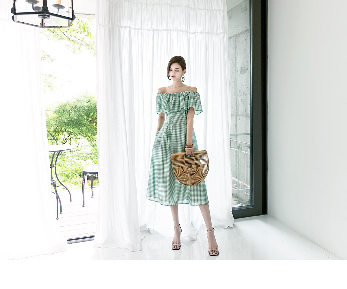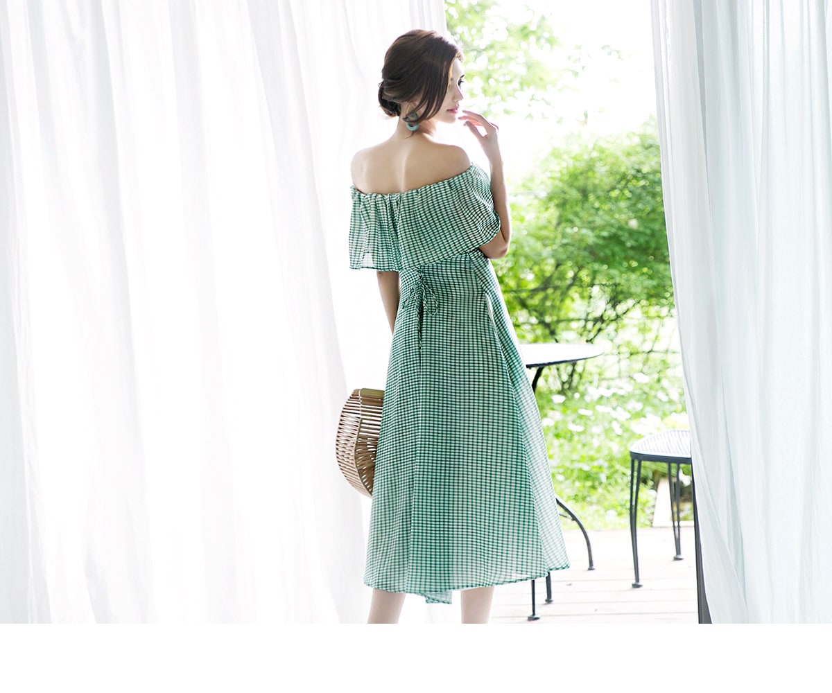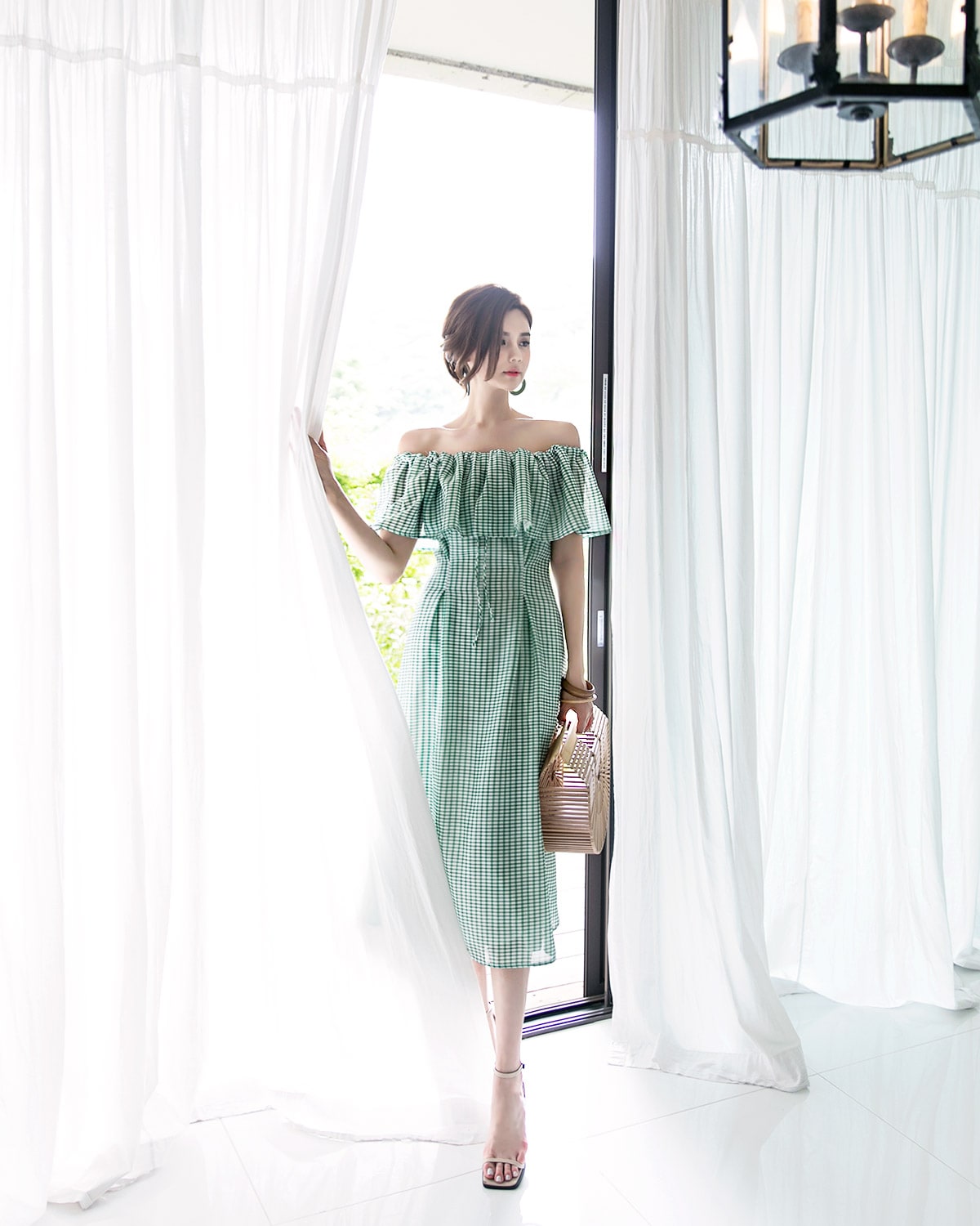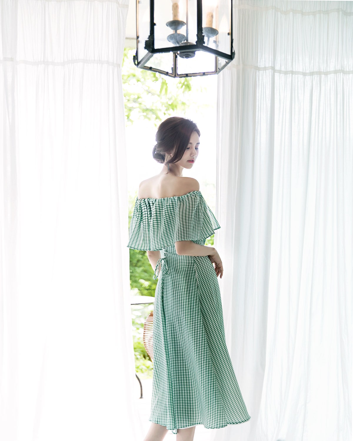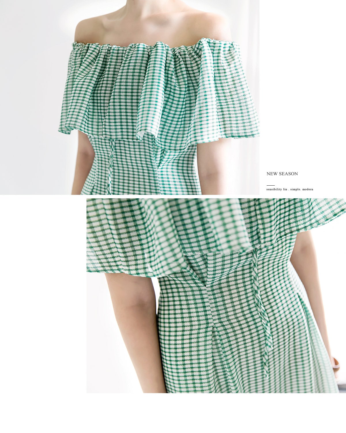 D3591 러플 스트링 라인 오프숄더 린넨 원피스 Green mix