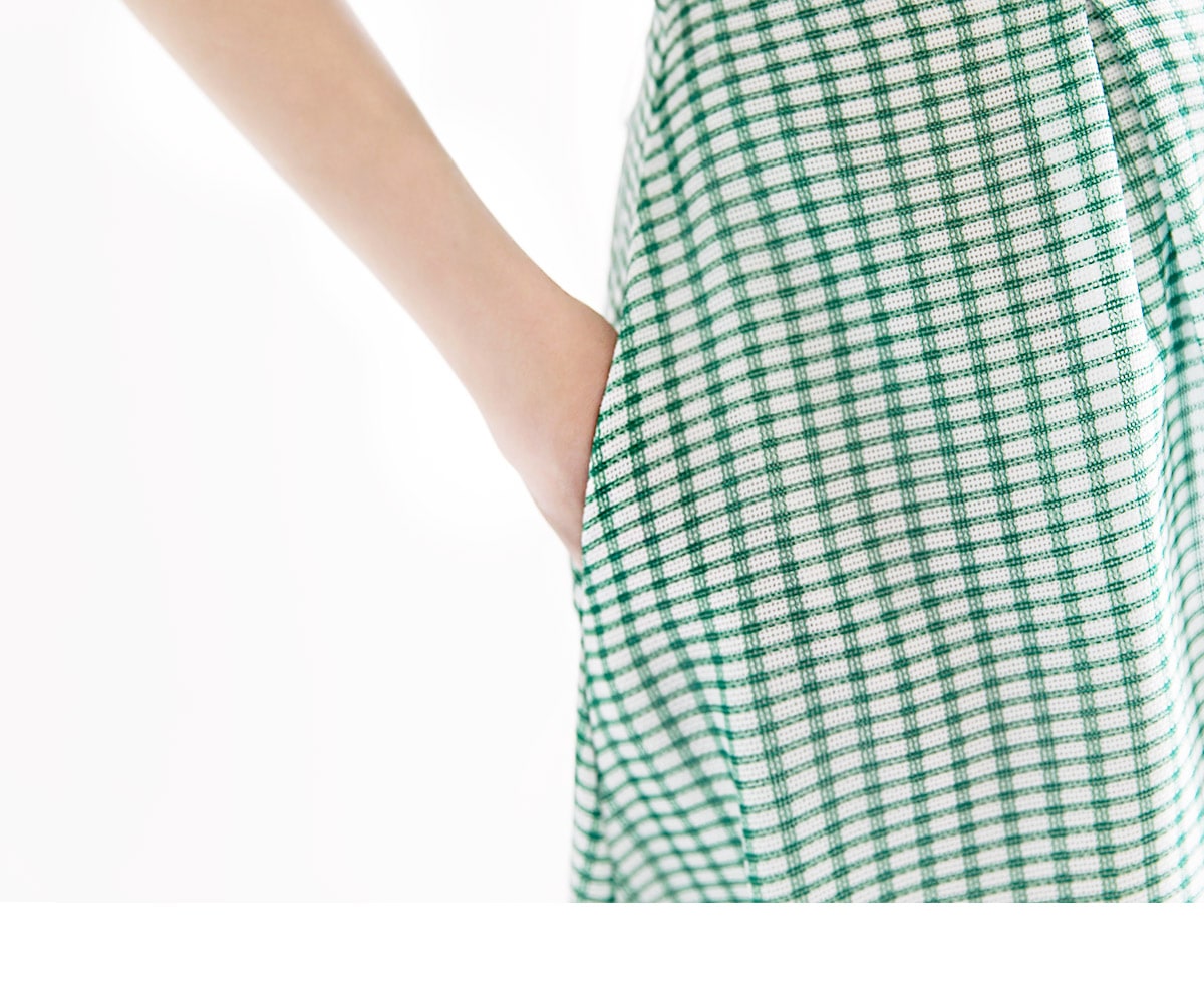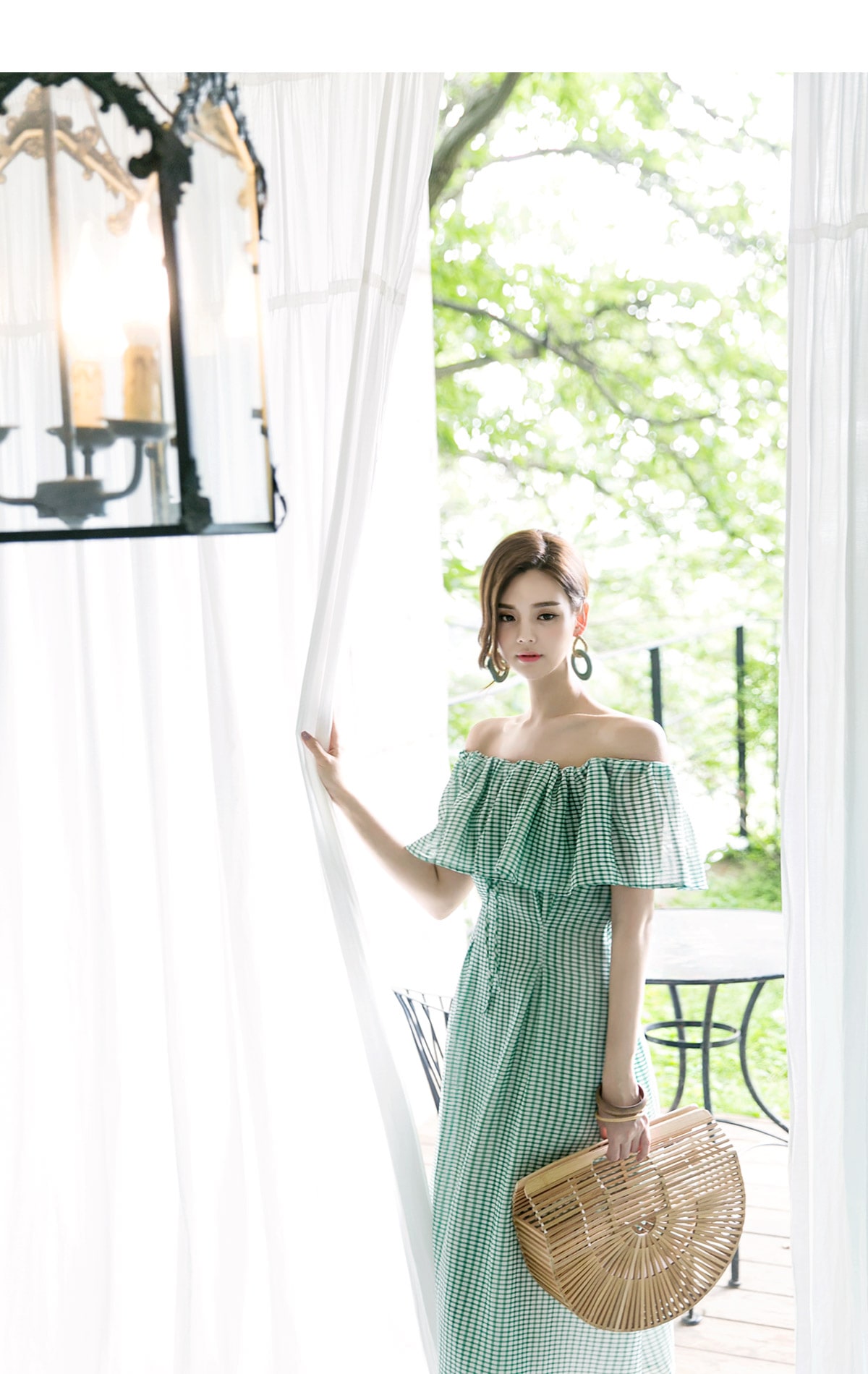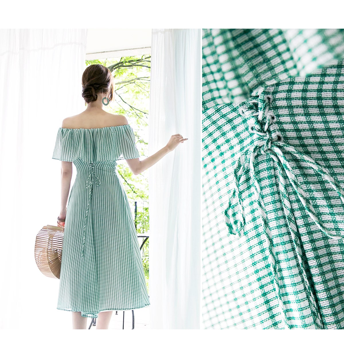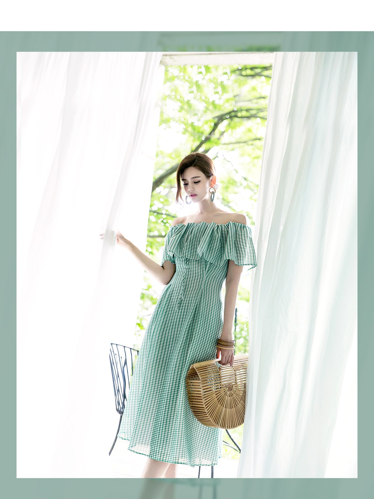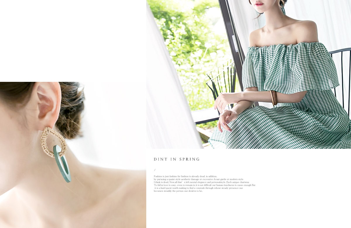 D3591 러플 스트링 라인 오프숄더 린넨 원피스 Green mix