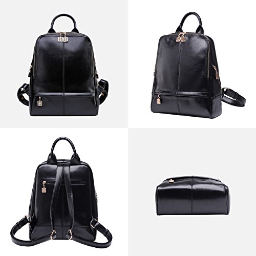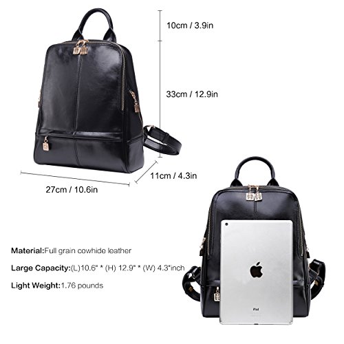 This women's Leather backpack contain 4 Outside pockets: 2 side pack,1 front purse and 1 back pocket.4 Inside pockets:1 generous pockets,1 wall zippered pocket,1 phone slot and 1 credentials pocket.Easily carry your mobile phone(iPhone6/6s/6plus/7/7plus)wallet,cosmetic,IPAD,umbrella and other daily essential things,but not fit the laptop or A4 magazine. It is a perfect genuine leather bag for women.