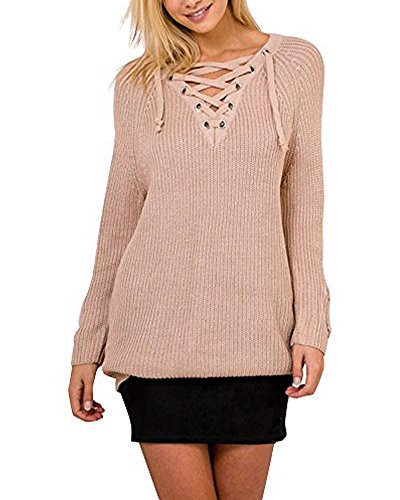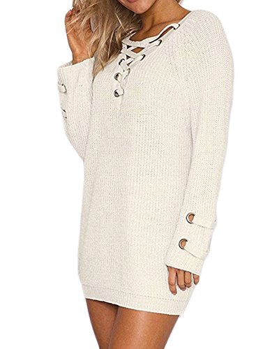 BOBIBI Women's Lace Up Front V Neck Long Sleeve Knit Pullover Sweater Mini Dress Tops.Perfect for autumn,winter.suit for coat or jacket.