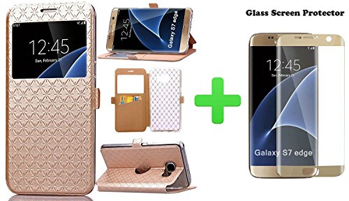 S7 Edge Case, Galaxy S7 Edge Case, ArtMine Quilted Plain Color Window View Function PU Leather Flip Folio Book Style Card Slots Kickstand Wallet Phone Case for Samsung Galaxy S7 Edge Blue