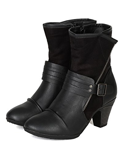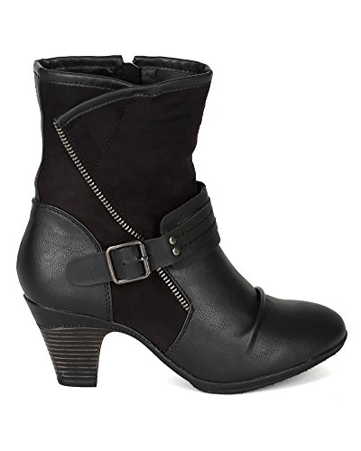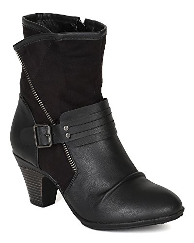 Bumper BF06 Women Mix Media Round Toe Ankle Strap Zipper Decor Ankle Bootie - Black
