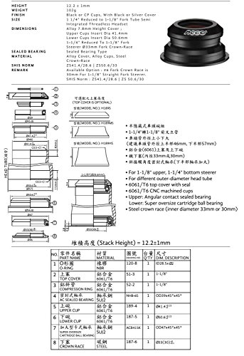 Product DescriptionUse for 1-1/8" (28.6mm) Stem Fits Headtube(ID.): 41.4-50.6mm Crown Race: 33mm Stack Height: 12.2±1mm For 1-1/8" Upper, 1-1/4" Bottom Steer MATERIAL: 6061/T6 CNC Machined Top Cover with Seals 6061/T6 CNC Forged CNC Machined Cups Steel Crown Race SHIS NORM: ZS41.4/28.6 | ZS50.6/33.0 0