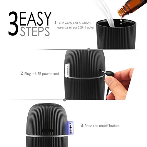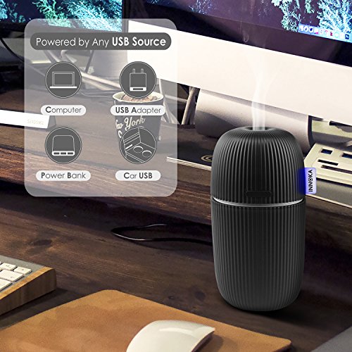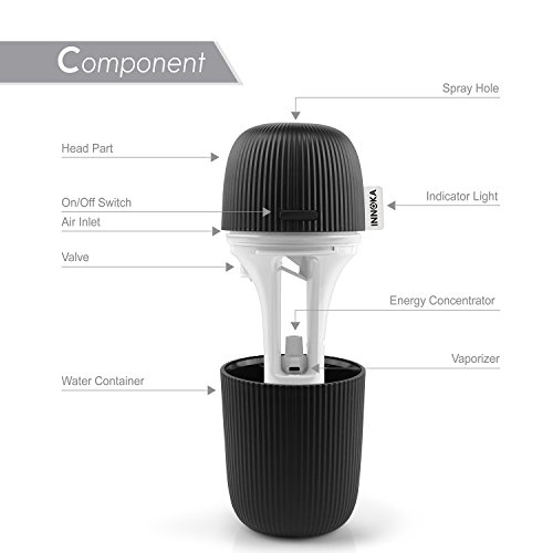 Works with any USB Power Source: Can be powered by laptop/PC, power bank, USB AC adapter; convenient to use in workplace or on the go. Color: Black. Container Volume: 110ml. Spray Volume: 30ml/hour (Humidification Mode); 15ml/hour (Aromatherapy Mode). Dimension: 2.75 x 5.75 inches. Power: 3W. Voltage: DC-5V. Material: PP. Note: DO NOT use hot water/high purified & distilled water; Do NOT fill water through the spray hole or touch it when the item is in use