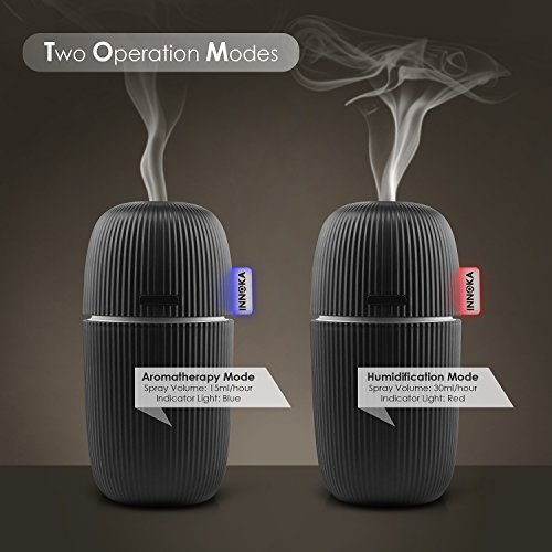 Dual Operation Mode: LED light indicator to show the operation mode absolutely clear, Humidification Mode (Red Light; Up to 4 hours working time), Aromatherapy Mode (Blue Light; Up to 8 hours working time). Portable & Lightweight: Ideal for home/bedroom/office/car/travel use; enjoy the health benefits while you are on the go and cannot carry your normal sized humidifier. Sleek and delicate design to fit in your home décor