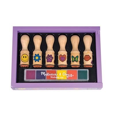 With cheerful artwork and easy-to-grasp handles, this set of 6 rubber stamps is perfect for preschoolers. The extra-long wooden handle keeps fingers off the stamp pad as kids stamp happy faces, mouthes, stars, butterflies and more. Housed in a sturdy wooden storage tray, the set also includes a six-color stamp pad. Ink is machine washable. With 6 unique designs, this set is the perfect gift set on its own.