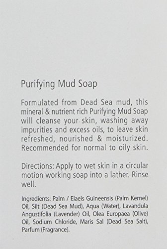 Formulated from Dead Sea mud, this mineral & nutrient rich Purifying Mud Soap will cleanse your skin, washing away impurities and excess oils, to leave skin refreshed, nourished & moisturized. Recommended for normal to oily skin. Directions: Apply to wet skin in a circular motion working soap into a lather. Rinse well.Feature