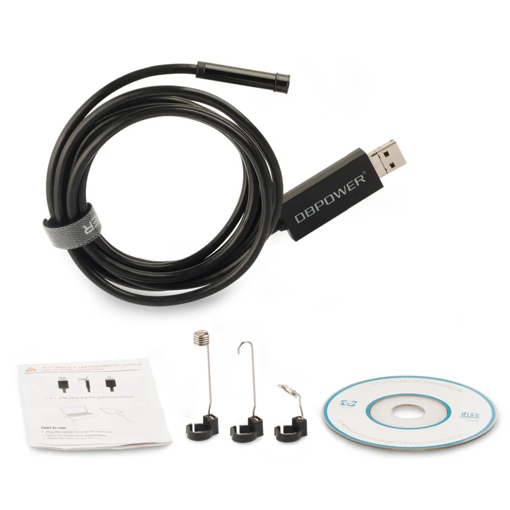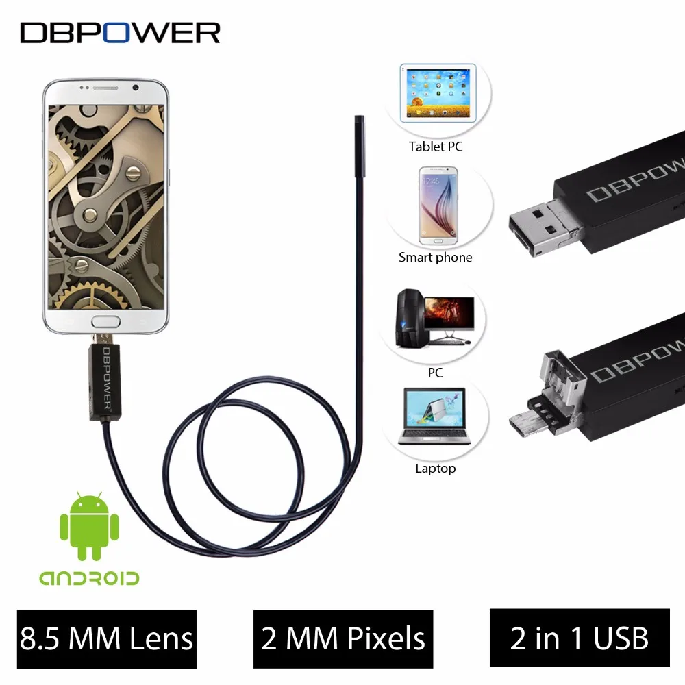 2 Meters DBPOWER 2 in 1 Endoscope Android&PC USB Inspection Camera 7MM 0.3MP 720P HD Borescope Video Cam 6 Adjust LED Night Vision DC 5V