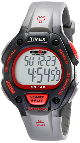 -. Feature : Sturdy and sporty, this Timex Ironman watch is designed for the athlete on the go. / Quartz movement with digital display / Protective acrylic dial window / Features include Indiglo® nightlight, 100-hour chronograph with lap and split times, 99-lap counter, 24-hour countdown timer with stop and repeat, 30-lap memory recall / Water resistant to 330 feet (100 M): suitable for snorkeling, as well as swimming, but not diving