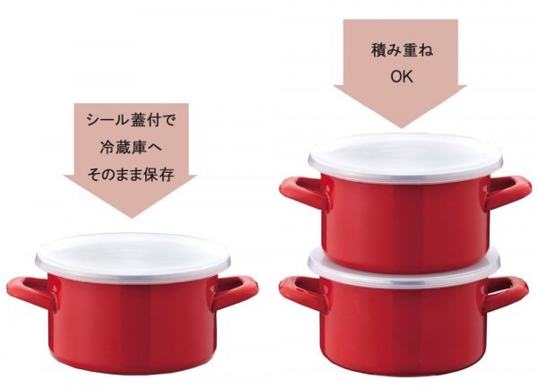 | 仕様 | オール熱源(ガス、IH100V・200V、シーズヒーター、ハロゲンヒーター、エンクロヒーター、ラジエントヒーター)対応 本体表面加工:ほうろう 強化の種類:全面物理強化 耐熱温度:シール蓋80度、耐冷温度:シール蓋-20度 食洗機非対応 |
